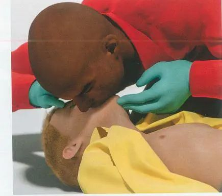 B人工呼吸,在无隔离面罩时,使用口对口吹气,捏住鼻子,您的嘴将患者的嘴完全包住,吹气2次,每次吹气1秒,观察胸部是否隆起。